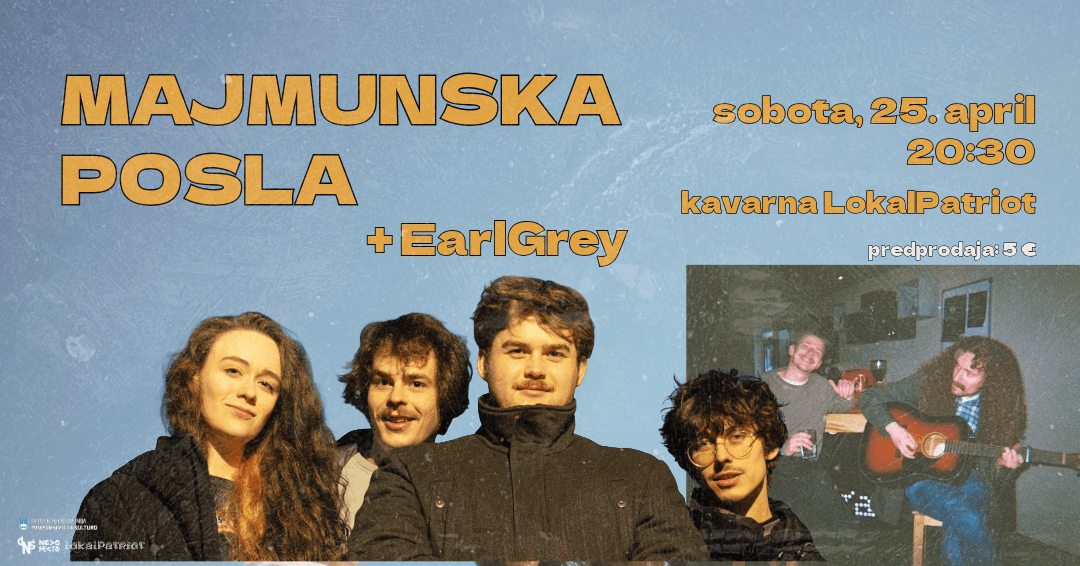 Vabljeni na predpočitniški koncert zasedbe Majmunska posla, ki bo v soboto, 25. aprila, ob 20:30 v kavarni LokalPatriot! Kot predskupino bosta nastopila EarlGrey. Cena vstopnic v predprodaji: 5 € Dan dogodka: 8 € Ansambel Majmunska Posla že od leta 2022 ustvarja glasbo po svojem okusu – iskreno, nepredvidljivo in žanrsko neukrotljivo. Njihov izraz je mešanica […]