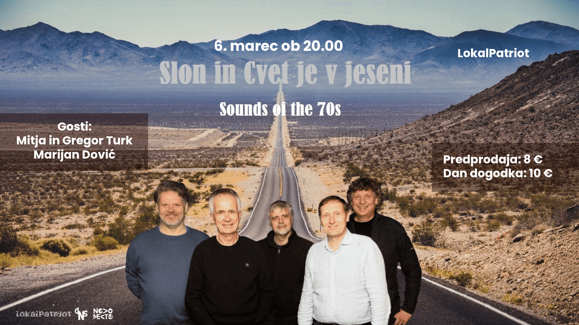 V petek, 6. marca, ob 20.00 bodo v LokalPatriotu nastopili Slon in Cvet je v jeseni. Skupino vodi član legendarne novomeške skupine Rudolfovo, Cveto Šali, kitarist in pevec. Družbo mu delajo Janez Lamovšek (pevec), Mitja Simič (kitara, vokal, orglice), Jernej Ban (bas) in Gusti Vrtar (bobni).  Igrali bodo glasbo skupine Rudolfovo, avtorske skladbe, Eaglese, Doobise, […]